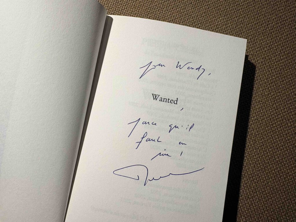 📚 Aanleiding voor deze ‘rencontre’ was de verschijning van Claudel’s nieuwe boek 𝘞𝘢𝘯𝘵𝘦𝘥, een absurd verhaal (of niet, want tegenwoordig buitelt de ene absurditeit over de andere heen en kijken we nergens meer van op…) over Elon Musk die op het idee komt om een beloning van $ 1 miljard uit te loven aan degene die Poetin omlegt. Klonk als interessant en dus kocht ik het na afloop van de salon (mét opdracht van Monsieur Claudel).